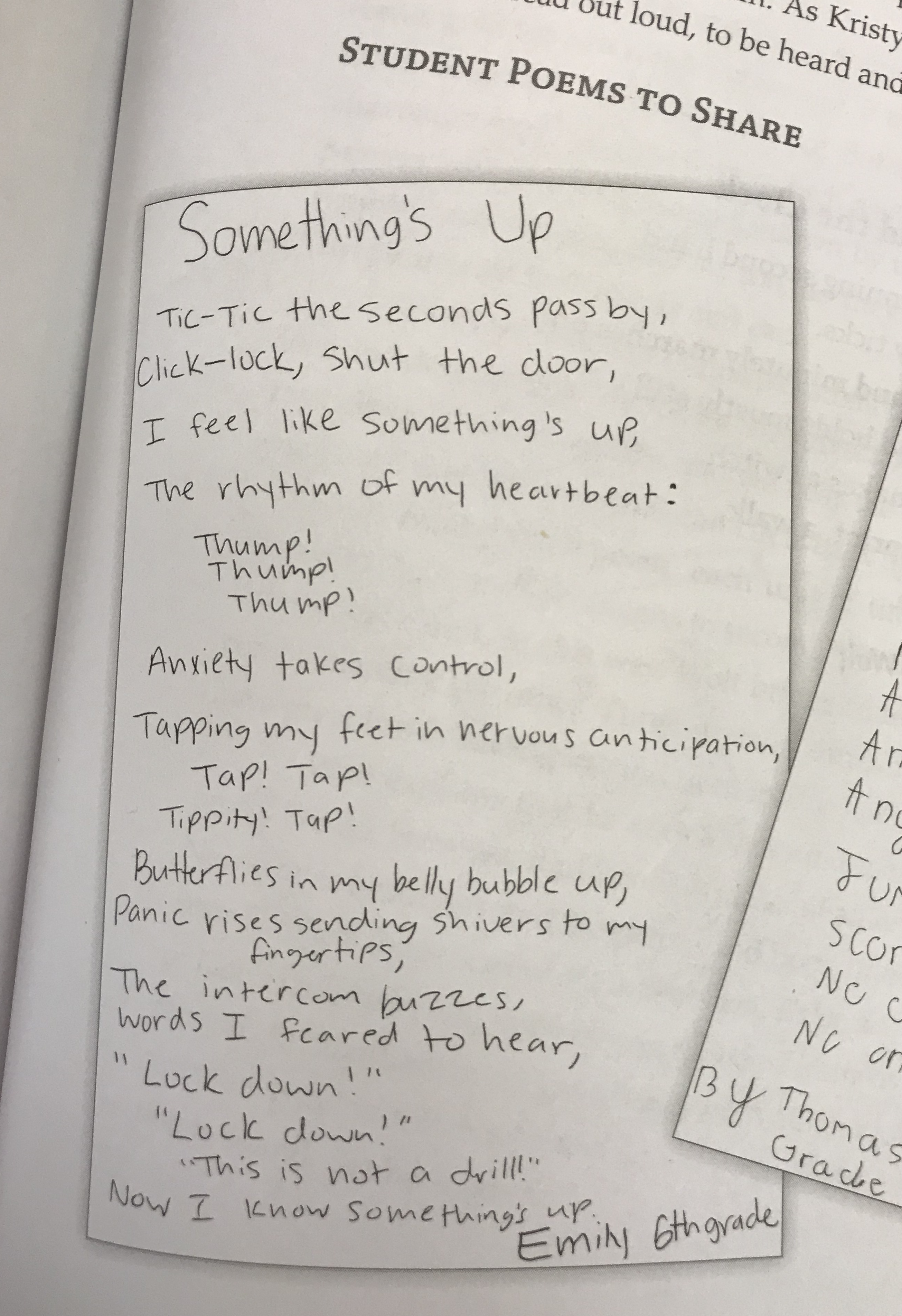 Mary Lee talked to my students about all the things that she thought about when she wrote the poem. She included thoughts from a book she was reading as well as loving thoughts about her husband, how he sees things that she doesn’t notice.