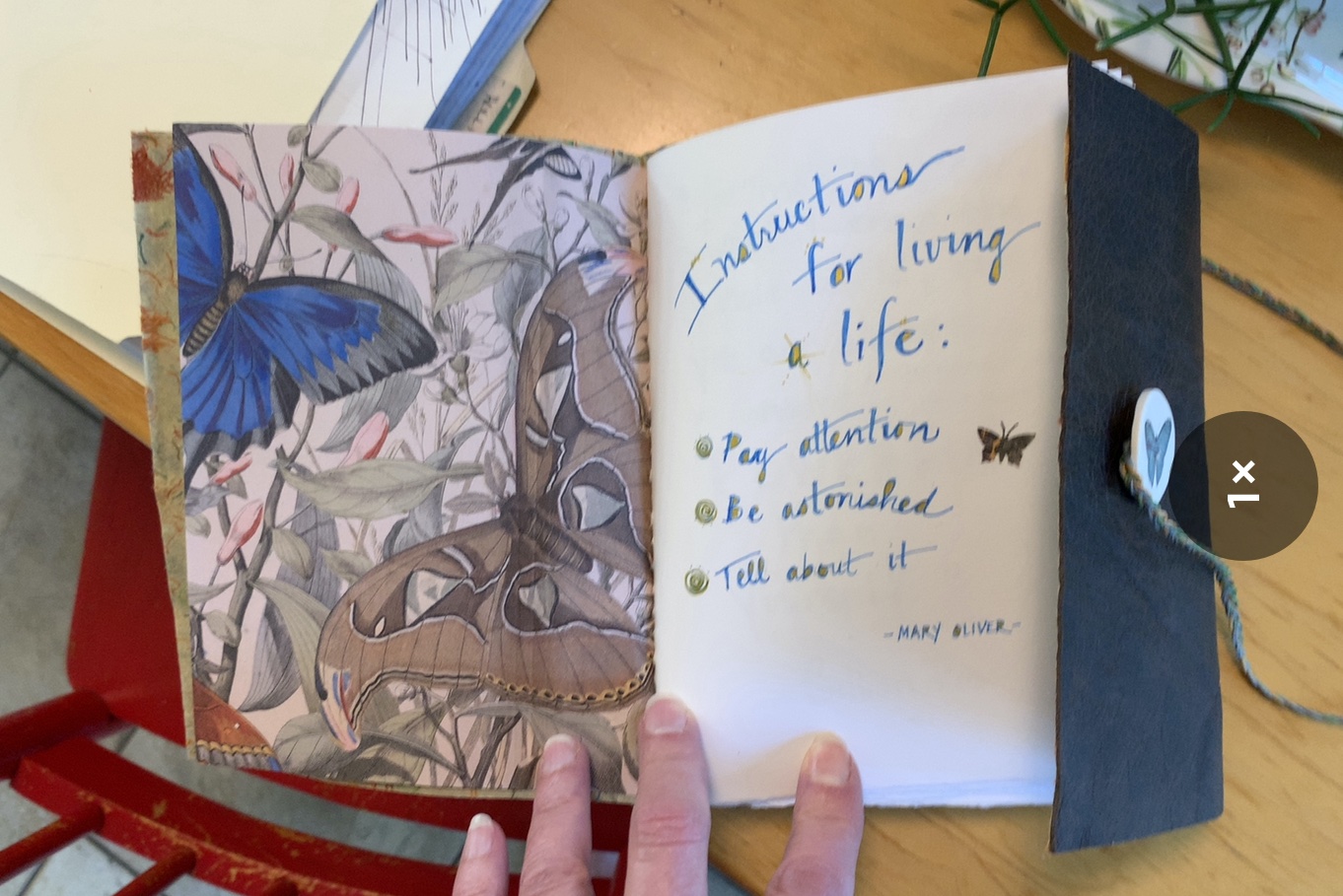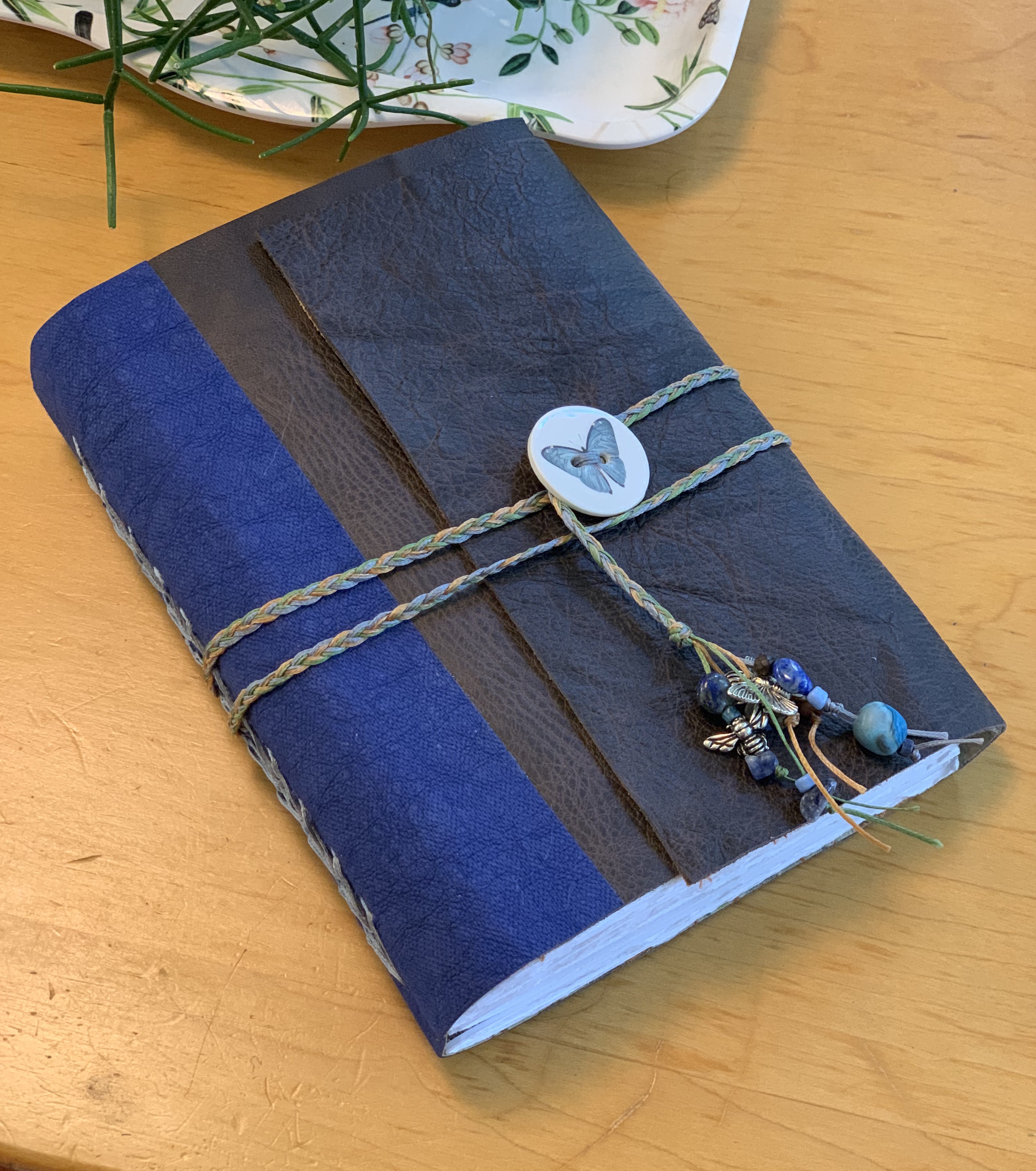 I kept seeing posts from Julie of beautiful handmade journals. I sent her a Direct Message, and she offered to make me one. (I did pay her.) The book is lovely, made of soft leather with a handmade butterfly button closure. vintage paper, spring flower binding, and 3 signatures of 98 lb. multi-media paper. (Yes, she wrote it all out on a notecard.) The braided thread wraps around and tucks into the button with a variety of beads, among them a silver bee and butterfly. She wrote, “May this journal always call your muse.”