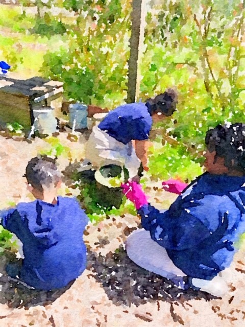 I was surprised at how excited they were to get down and dirty. Kaia said, “I have a poem.” We had also talked about writing secret poems for poetry month and placing them in the garden.