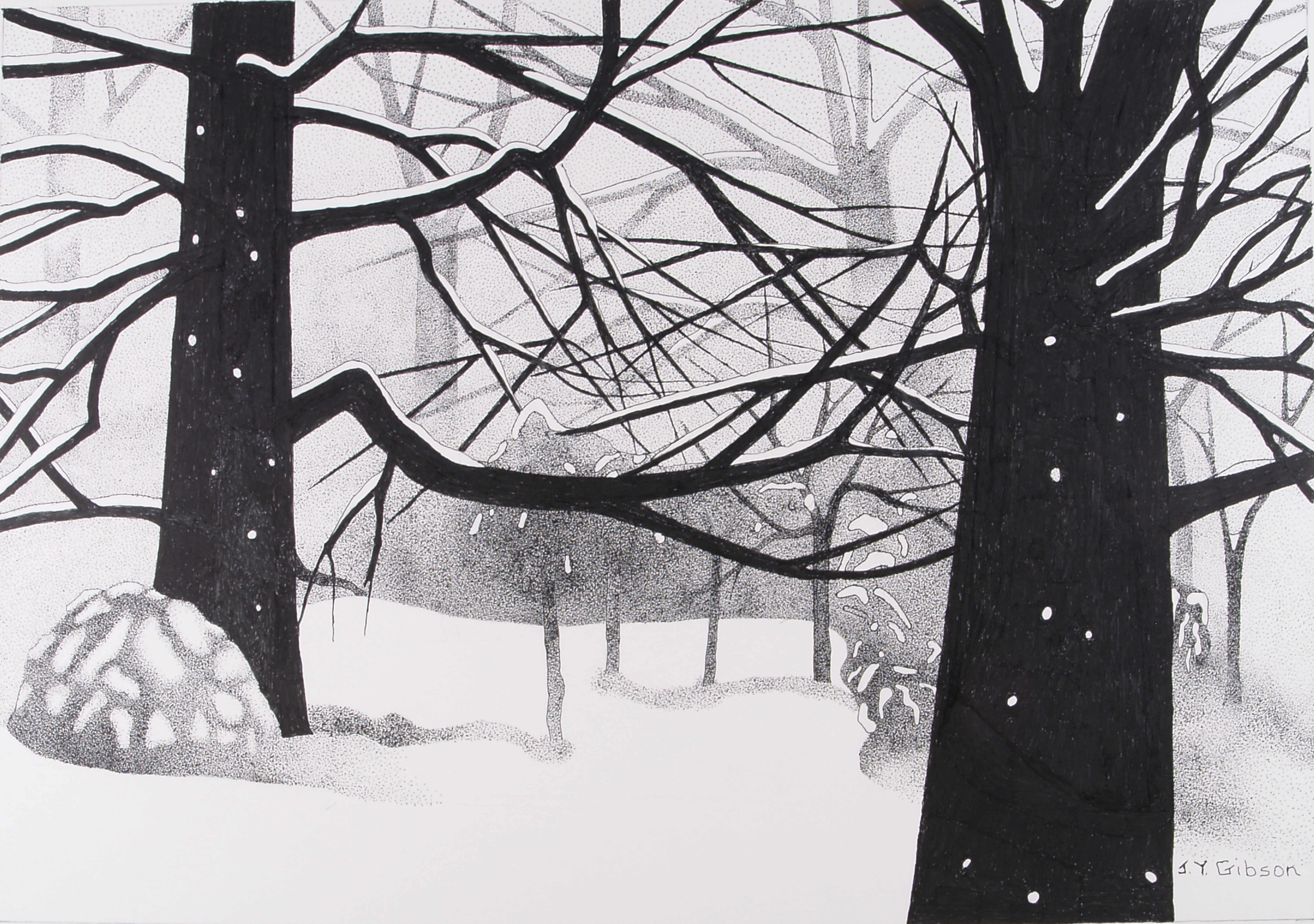 Like an excited child, I have been up since 5:30 AM checking for snow…no. There is some ice accumulating on the deck, so I suppose it is a good thing little southern children are not having to stand outside and wait for buses that do not handle ice on roads well. Hey, I’m not complaining. I get a free day. But as I look at my father’s drawing of this beautiful silent scene of snow, I can’t help but wish I could see this in my own yard, if only for a few moments. There is something silent and magical about the first snow.