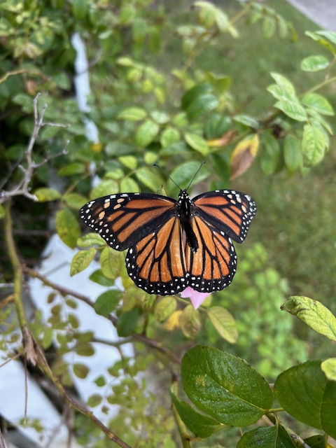 While walking in my neighborhood, I saw this large monarch sitting on the ground, barely moving. I crouched down expecting it to fly away, but she stayed very still. I gently placed my finger under her legs and she stayed there on my hand. I marveled at this moment while also worrying about why she was so lethargic. Had she just landed after a long trip from the north? Was she hungry?