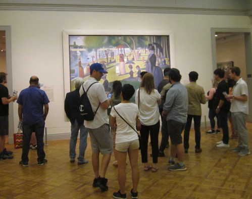 The summer is made so much brighter by the exchange of poems arranged by Tabatha Yeatts. Mailboxes share a bit of insight (along with the proverbial wasp or two). I have been pleased to receive two poems so far. The first sent from our friend Ruth Hersey. Ruth sent a postcard of a Georges Seurat painting, one we are all likely familiar with. She also sent this photo that she took of observers of the same painting. Her poem comes from the wisdom of watching these observers.