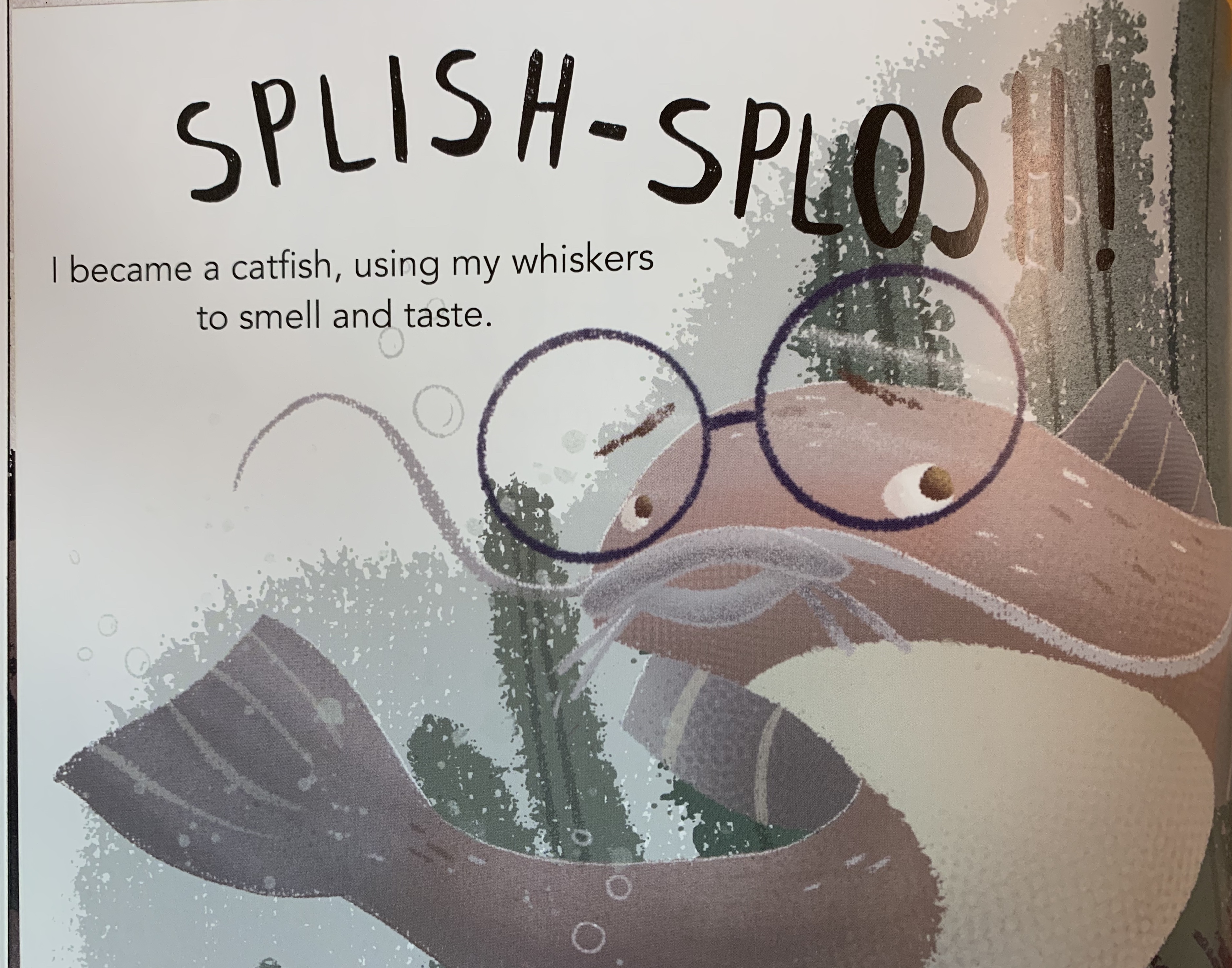 Drew has taken Gayle’s idea and created an adorable Cajun girl who wears glasses and wonders what life would be like as different animals in the swamp. The wide round glasses appear on each animal to help our young readers understand that this Cajun girl was once an alligator, a heron, an opossum, and more.