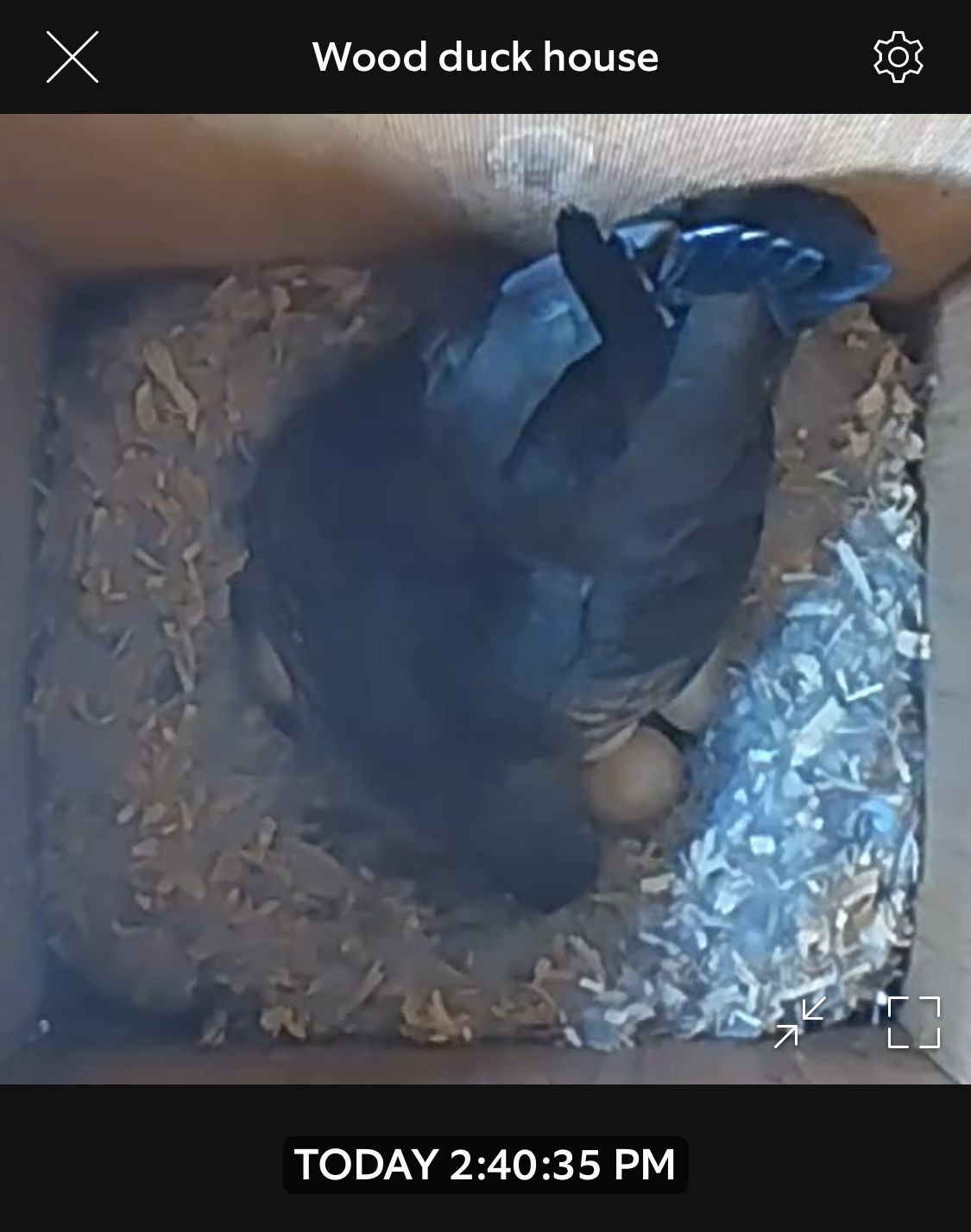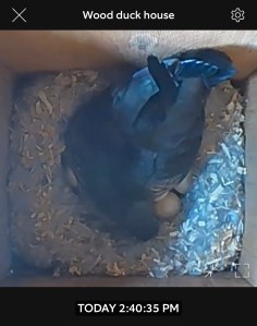 Egg incubation is 25-30 days. I marked that the first night of sitting was on May 5th, so we should see hatching in the next week or so. The babies are colored like bumblebees, yellow and black feathering. Whether wood ducks or whistlers, our nest box continues to entertain us.