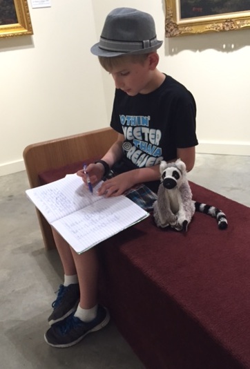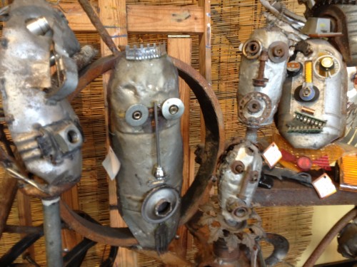 One of our stops on the writing marathon was the A&E Gallery, a collaborative gallery of a variety of artists owned by Paul Schexnayder. We did two writing periods at the gallery. During the first one, I asked the students to walk all around the space and to collect words that came into their minds as they walked. After collecting words, we found a spot to sit and write. The second prompt was an ekphrastic poem about one particular piece of art. I am sharing the poem I wrote from the gallery walk and a student’s poem from a group of metal faces.