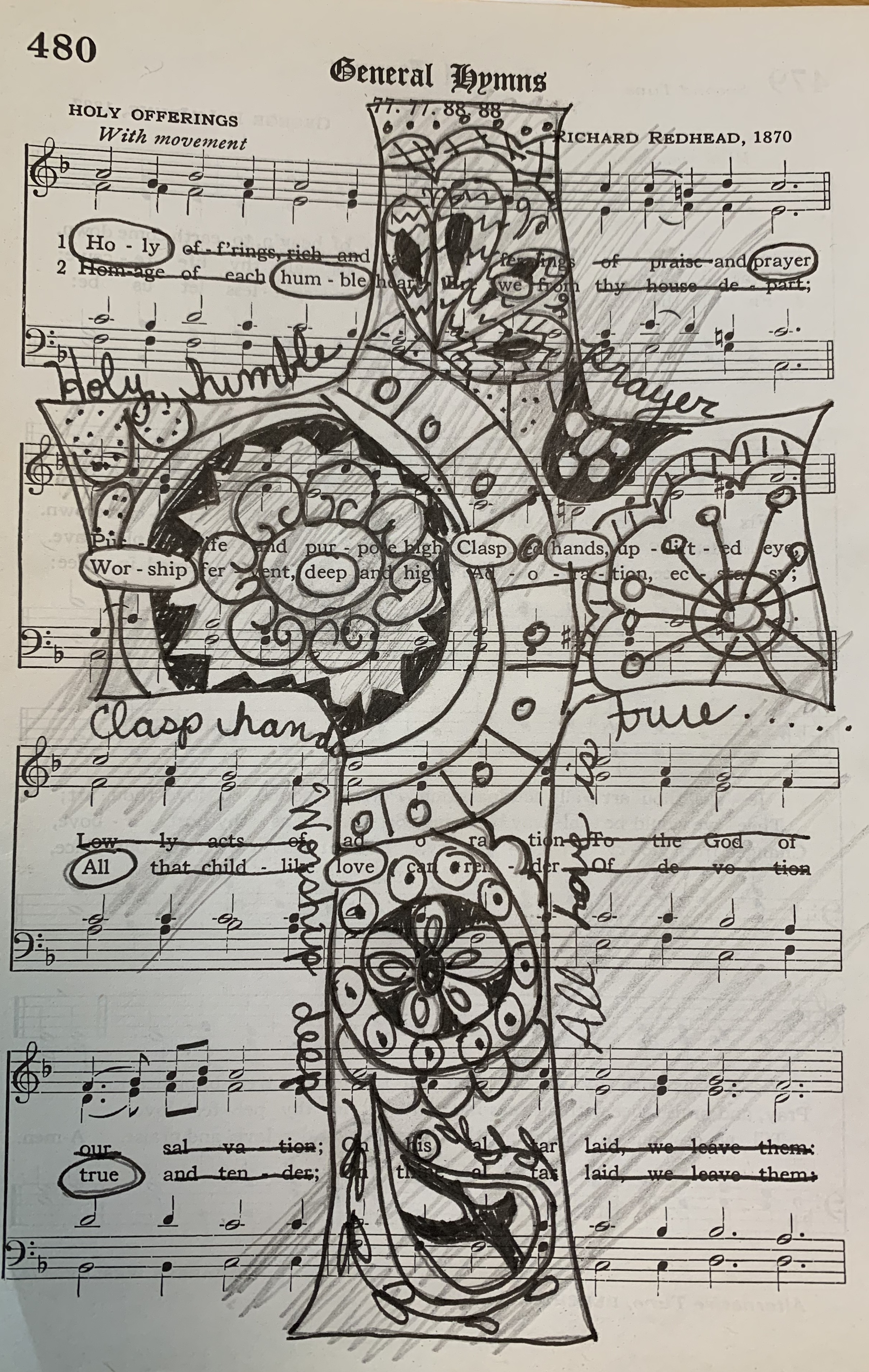 Today is the first Thursday of November and a group of bloggers gather to share their spiritual journey. Fran selected the theme for today, holy. I immediately thought of the hymn Holy, Holy, Holy. I thought of the torn apart hymnal I was given by an artist friend to use for collage. I didn’t find that hymn but one that did use the word Holy. I wanted to create an erasure or black out poem. I googled Zentangle designs and set to work on the page.